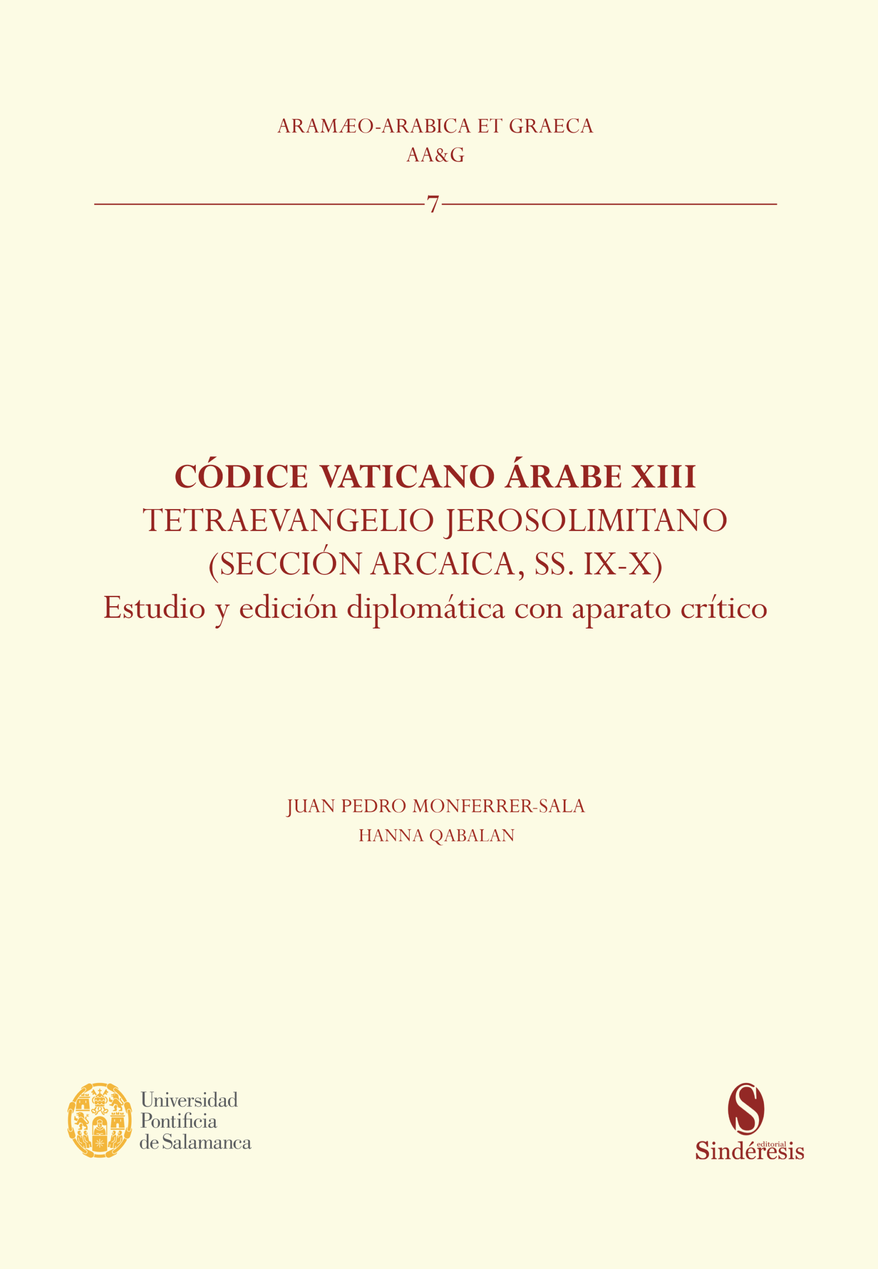 Códice Vaticano Árabe XIII. Tetraevangelio Jerosolimitano (Sección Arcaica, SS. IX-X). Estudio y edición diplomática con aparato crítico/Juan Pedro Monferrer Sala. Hanna Qabalan–Salamanca : UPSA Ediciones. Madrid Editorial Sindéresis 2023. 307 p. ; 905 g. – (Colección Arameo Arábica et Graeca 7)