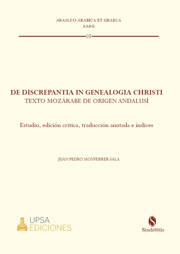 De Discrepantia In Genealogia Christi. Texto Mozรกrabe de Origen Andalusรญ. Estudio, edicioฬn critica, traduccioฬn anotada e iฬndices/ย Juan Pedro Monferrer SalaโSalamanca : UPSA Ediciones. Madrid Editorial Sindรฉresis 2025. 108ย p. ; 445 g. โ (Colecciรณn Arameo Arรกbica et Graeca 10)